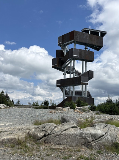 Cette tour de plus de 14 mètres, plancher à plancher, permet d'accéder à une vue à 360 degrés dégagée au-dessus de la canopée particulièrement en direction des montagnes blanches américaines et du Mont Washington visibles de ce point de vue tout en respectant notre mission de conservation.